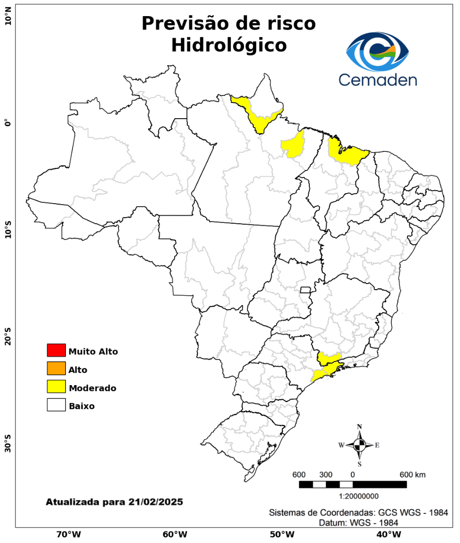 Nesta sexta-feira (21/02/2025), o cenário de risco de eventos geo-hidrológicos para as regiões do Brasil é apresentado a seguir: