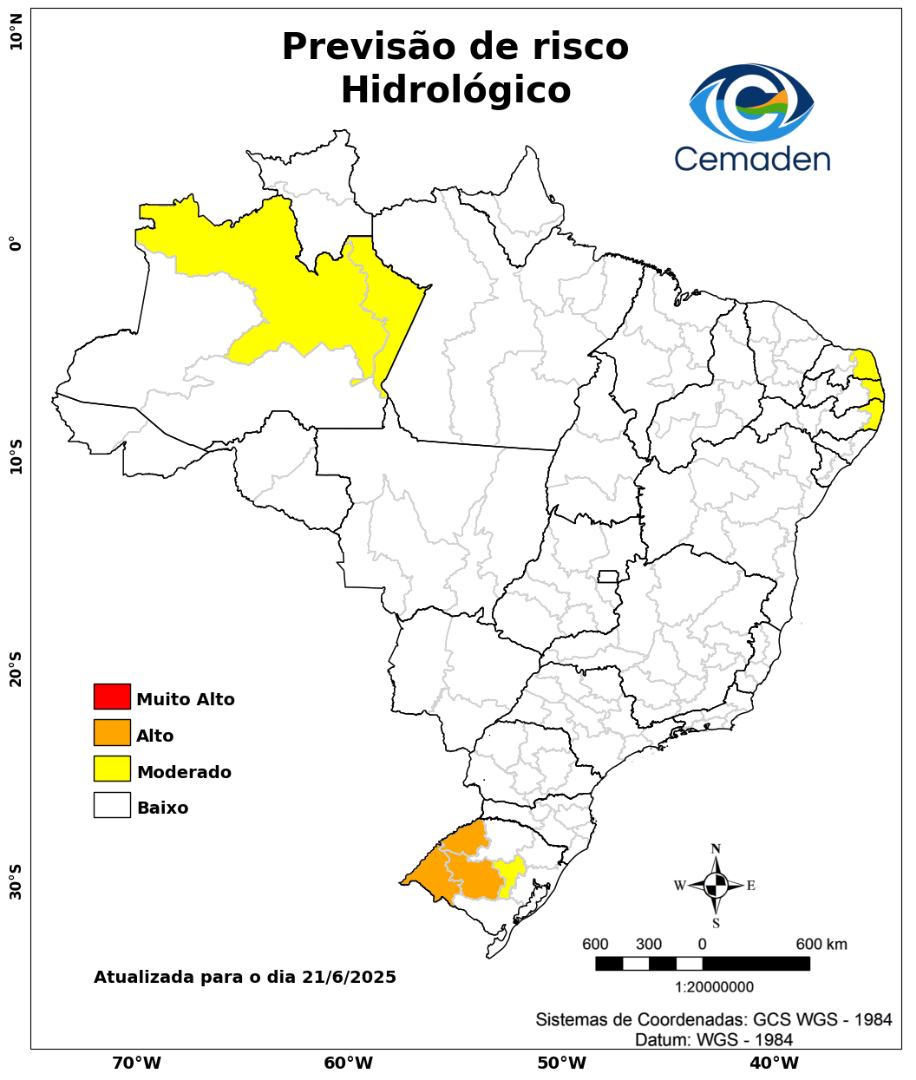 Neste sábado (21/06/2025), o cenário de risco de eventos geo-hidrológicos para as regiões do Brasil é apresentado a seguir: