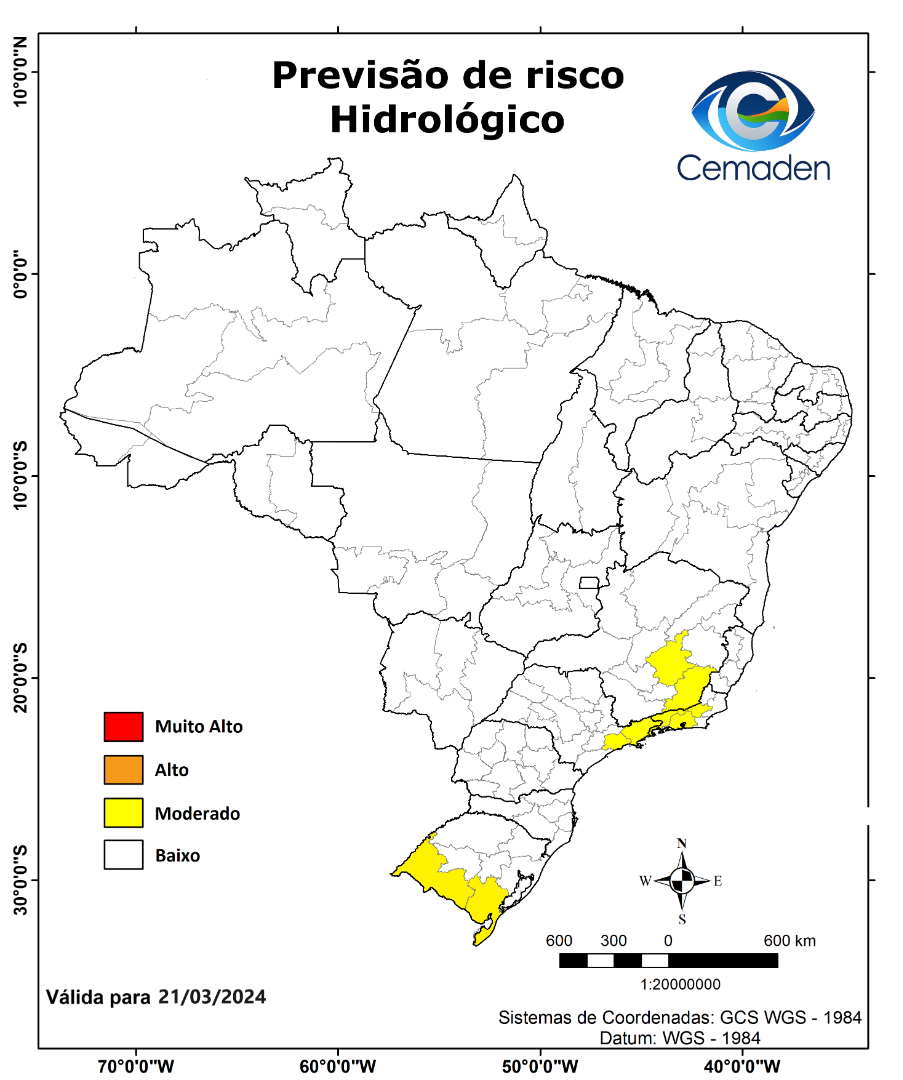 Nesta quinta-feira (21/03/2024), o cenário de risco de eventos geo-hidrológicos para as mesorregiões do Brasil é apresentado a seguir: