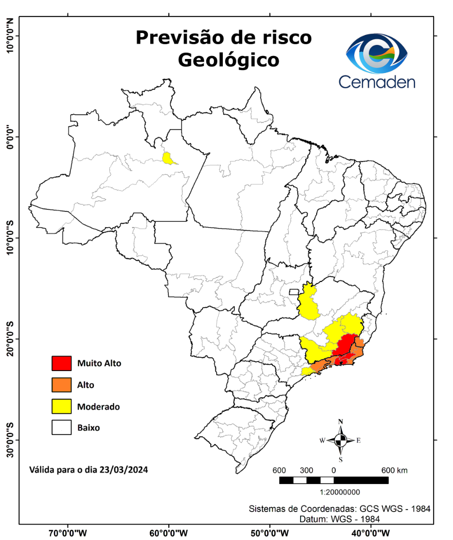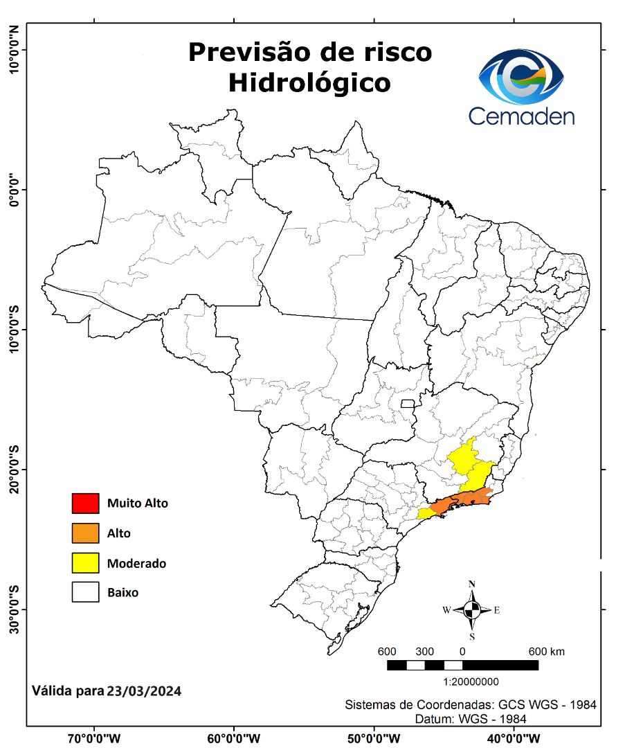 Neste sábado (23/03/2024), o cenário de risco de eventos geo-hidrológicos para as mesorregiões do Brasil é apresentado a seguir: