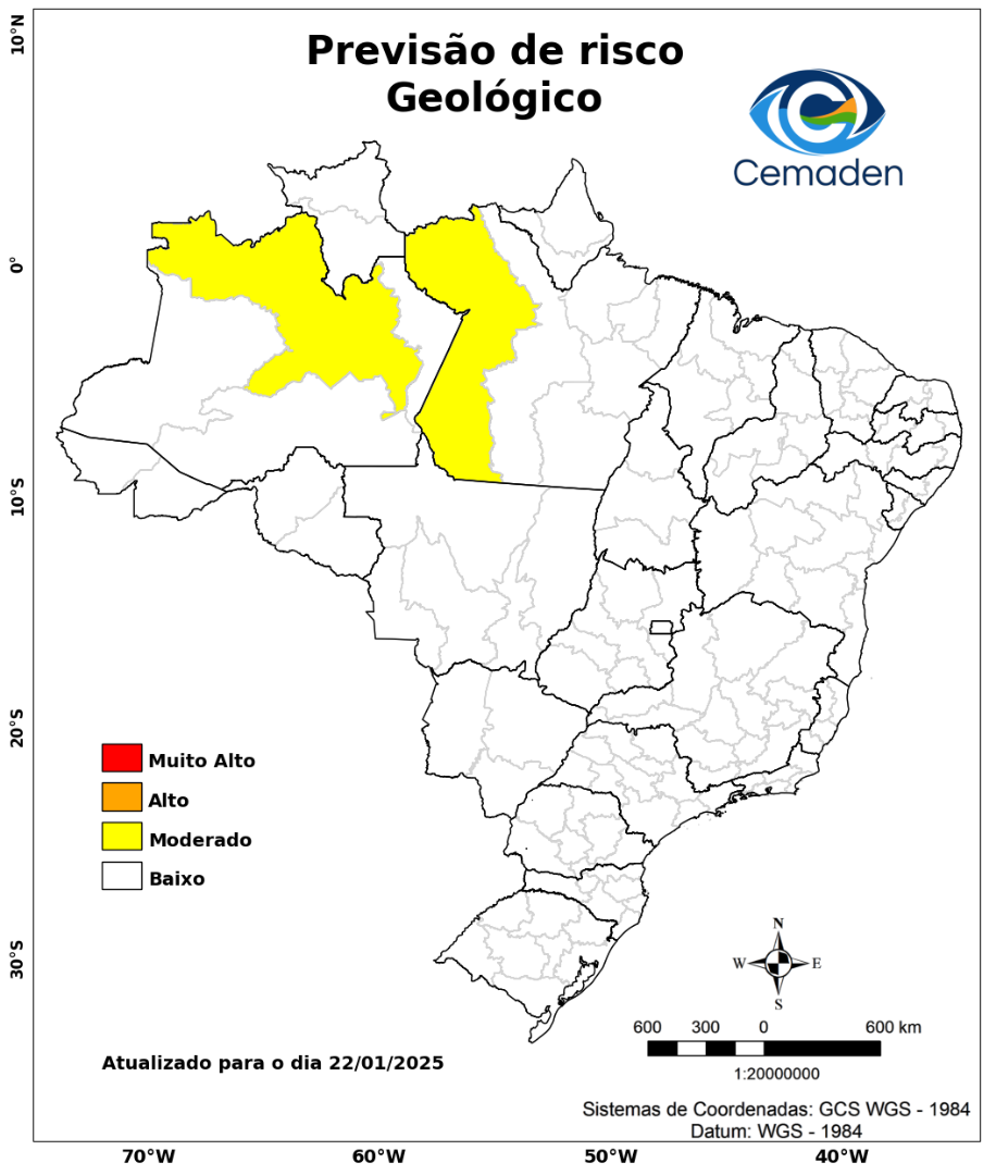 Nesta quarta-feira (22/01/2025), o cenário de risco de eventos geo-hidrológicos para as regiões do Brasil é apresentado a seguir:
