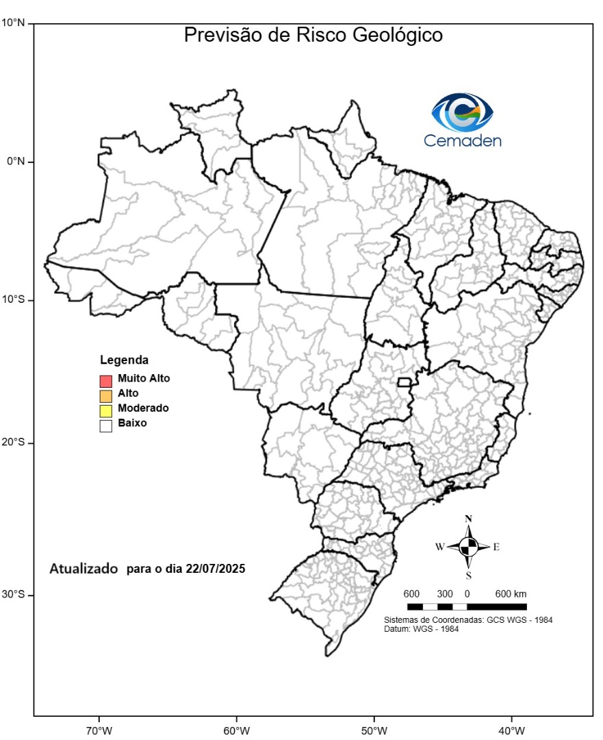 Figura 2 - Probabilidade de ocorrência de deslizamentos de terra em ao menos um município das Regiões Geográficas Intermediárias (e/ou subdivisões regionais) indicadas. Este mapa é elaborado por uma equipe multidisciplinar, levando em consideração as condições dos cenários de riscos geológicos atuais somados à previsão de chuva.