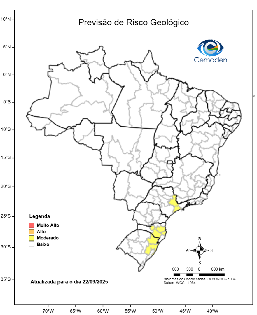 Figura 2 - Probabilidade de ocorrência de deslizamentos em ao menos um município das mesorregiões (e/ou subdivisões regionais) indicadas. Este mapa é elaborado por uma equipe multidisciplinar, levando em consideração as condições dos cenários de riscos geológicos atuais somados à previsão de chuva.