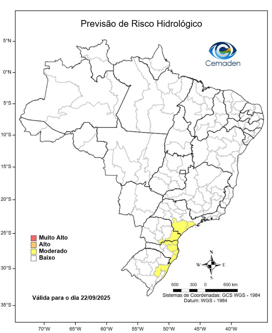 Figura 1 - Possibilidade de ocorrência de eventos hidrológicos em ao menos um município das Regiões Geográficas Intermediárias indicadas. Este mapa é elaborado por uma equipe multidisciplinar, levando em consideração os cenários de riscos hidrológicos atuais somados à previsão de chuva.