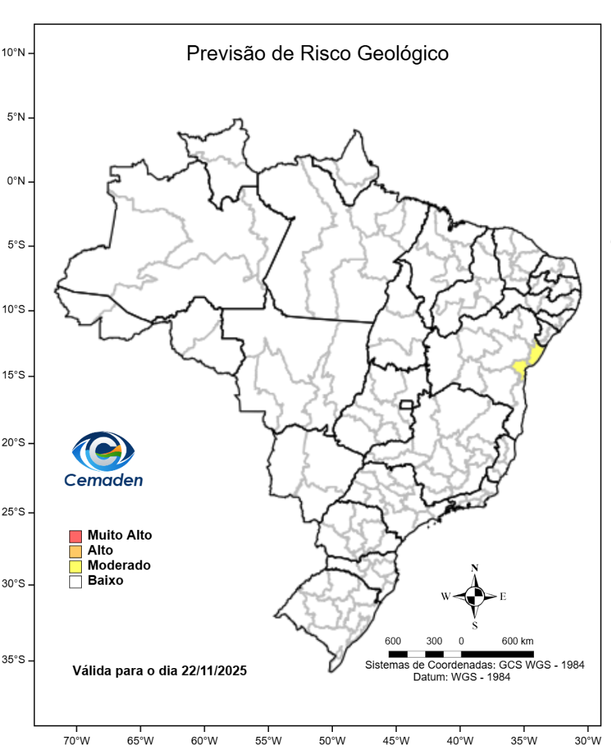 Figura 2 - Probabilidade de ocorrência de deslizamentos em ao menos um município das mesorregiões (e/ou subdivisões regionais) indicadas. Este mapa é elaborado por uma equipe multidisciplinar, levando em consideração as condições dos cenários de riscos geológicos atuais somados à previsão de chuva.