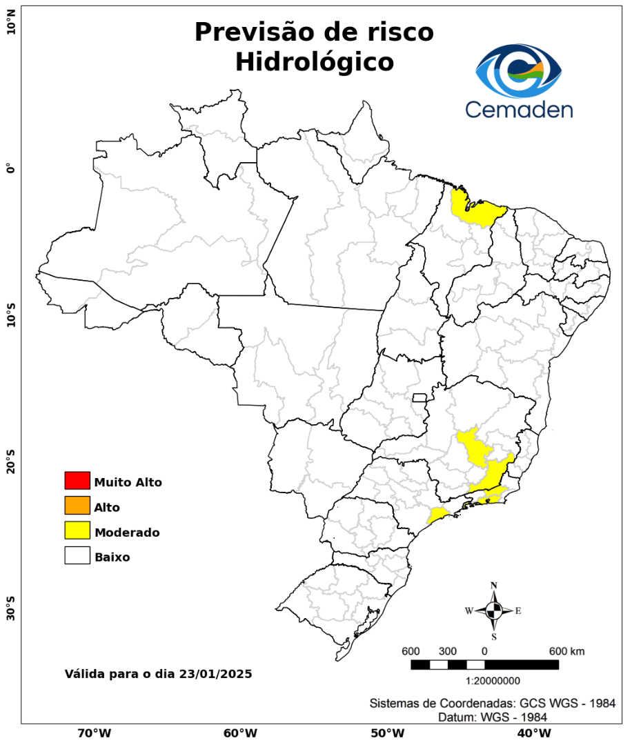 Nesta quinta-feira (23/01/2025), o cenário de risco de eventos geo-hidrológicos para as regiões do Brasil é apresentado a seguir: