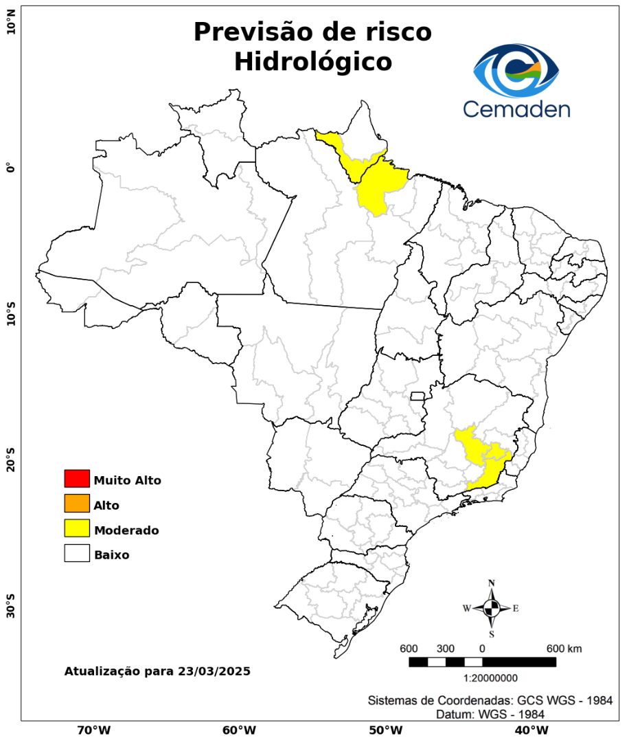 Neste domingo (23/03/2025), o cenário de risco de eventos geo-hidrológicos para as regiões do Brasil é apresentado a seguir: