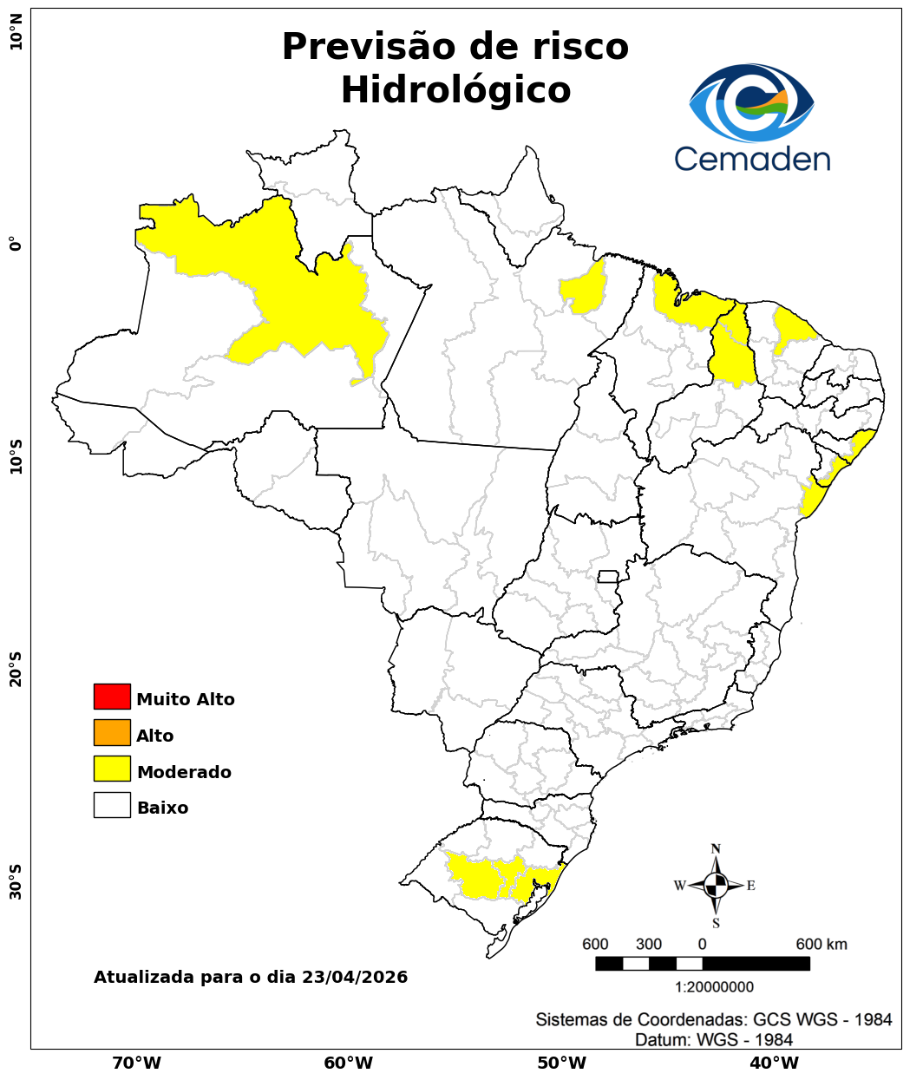 Nesta quinta-feira (23/04/2026), o cenário de risco de eventos geo-hidrológicos para as regiões do Brasil é apresentado a seguir: