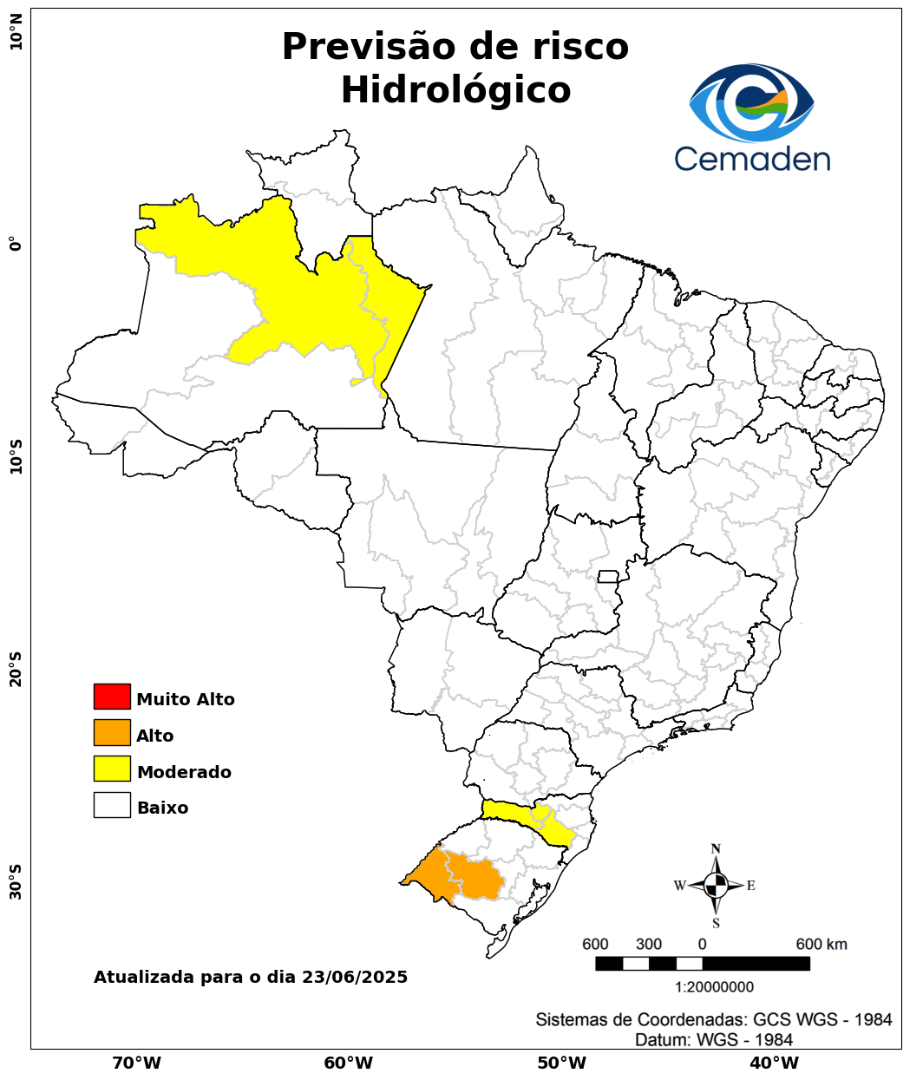 Nesta segunda-feira (23/06/2025), o cenário de risco de eventos geo-hidrológicos para as regiões do Brasil é apresentado a seguir: