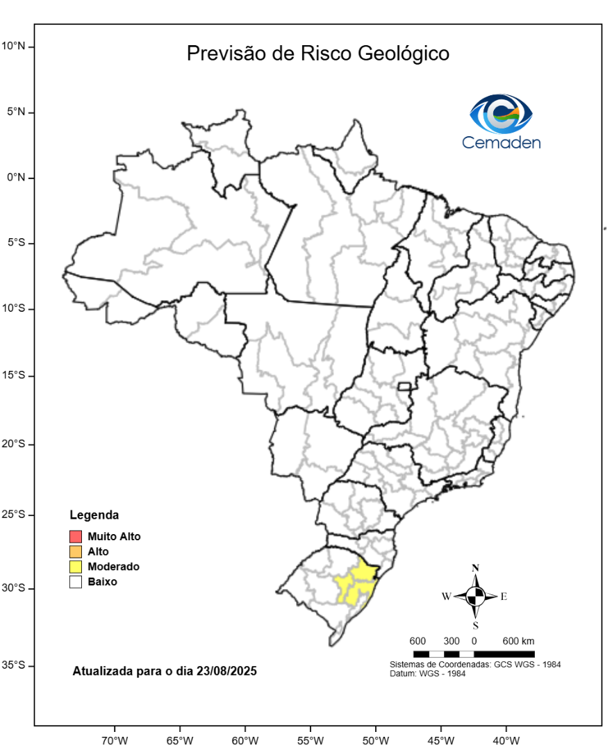 Neste sábado (23/08/2025), o cenário de risco de eventos geo-hidrológicos para as regiões do Brasil é apresentado a seguir: