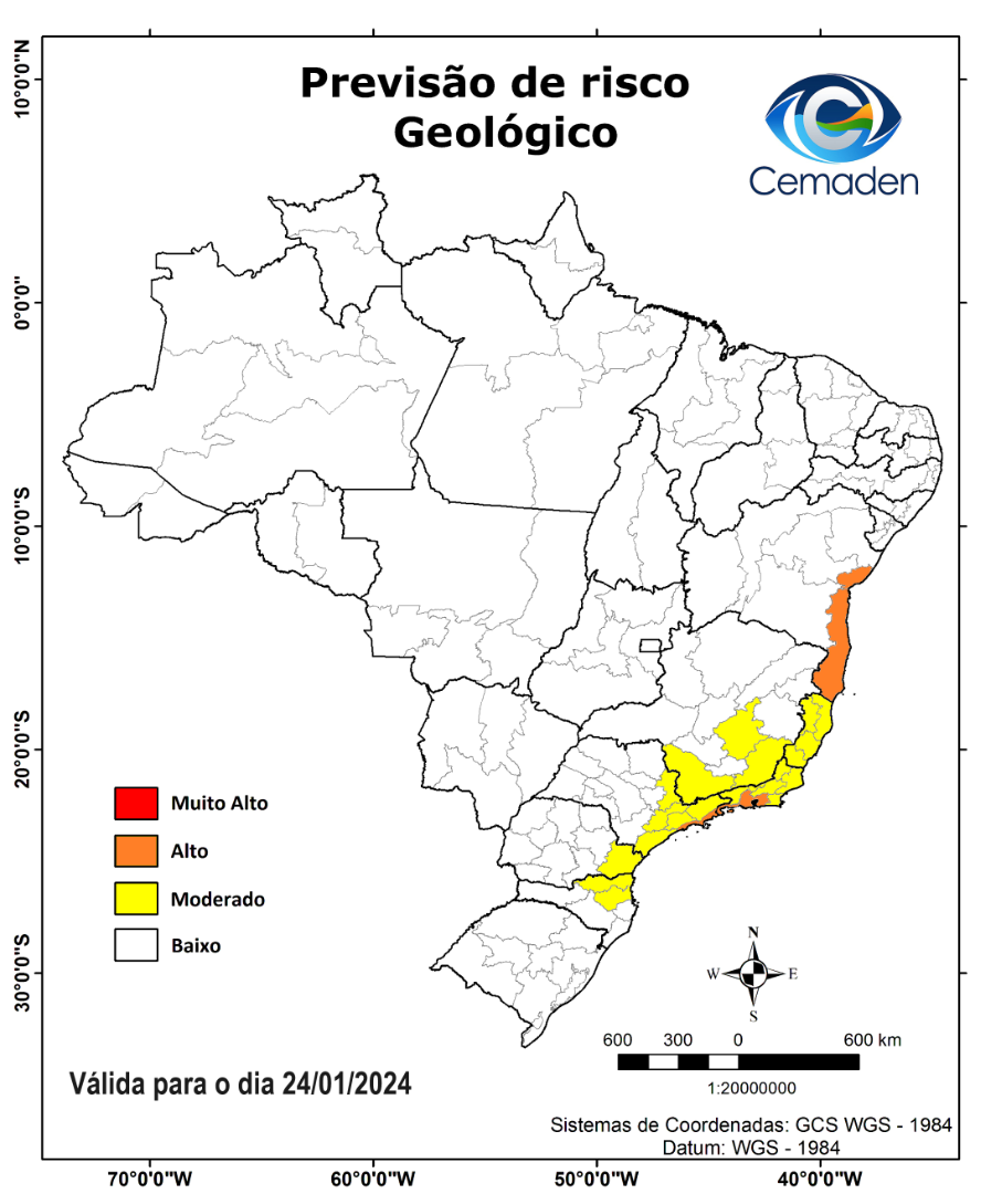 Nesta quarta-feira (24/01/2024), o cenário de risco de eventos geo-hidrológicos para as mesorregiões do Brasil é apresentado a seguir: