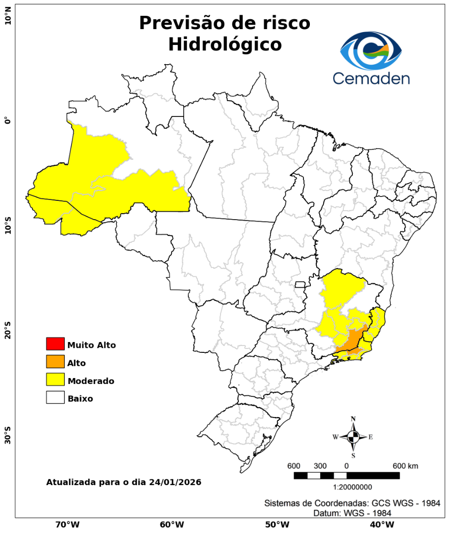 Neste sábado (24/01/2026), o cenário de risco de eventos geo-hidrológicos para as regiões do Brasil é apresentado a seguir: