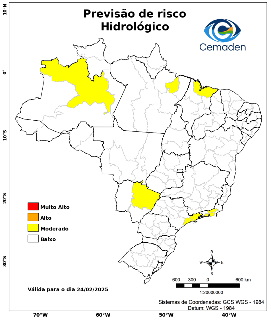 Nesta segunda-feira (24/02/2025), o cenário de risco de eventos geo-hidrológicos para as regiões do Brasil é apresentado a seguir:
