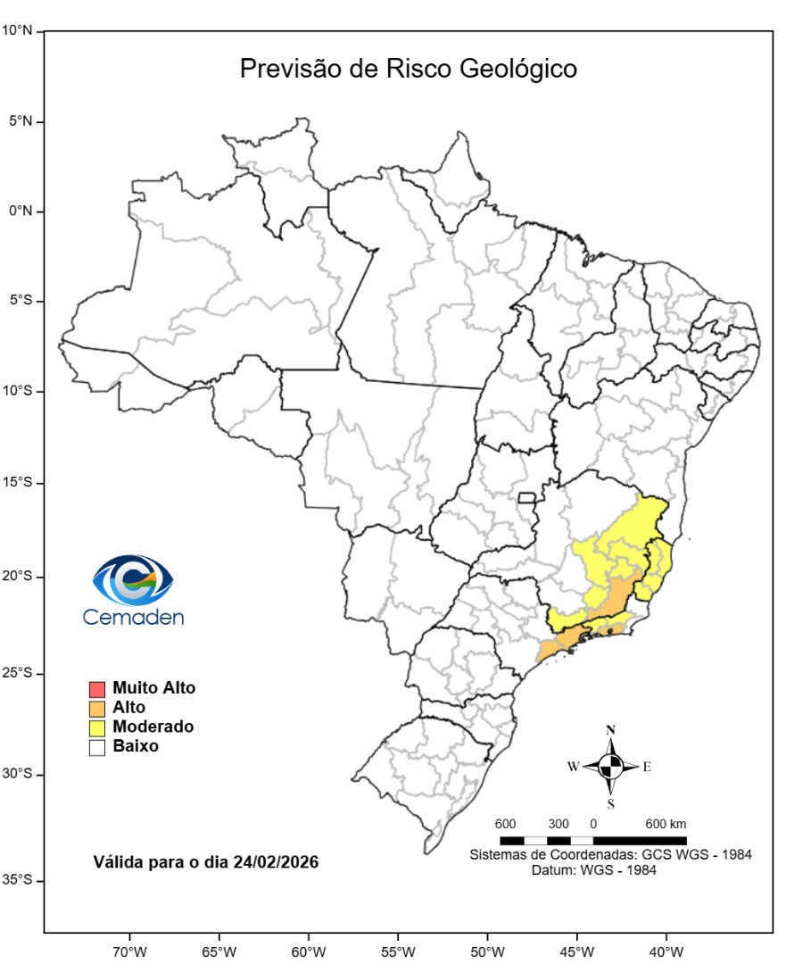 Nesta terça-feira (24/02/2026), o cenário de risco de eventos geo-hidrológicos para as regiões do Brasil é apresentado a seguir: