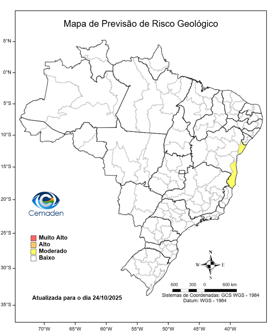 Nesta sexta-feira (24/10/2025), o cenário de risco de eventos geo-hidrológicos para as regiões do Brasil é apresentado a seguir: