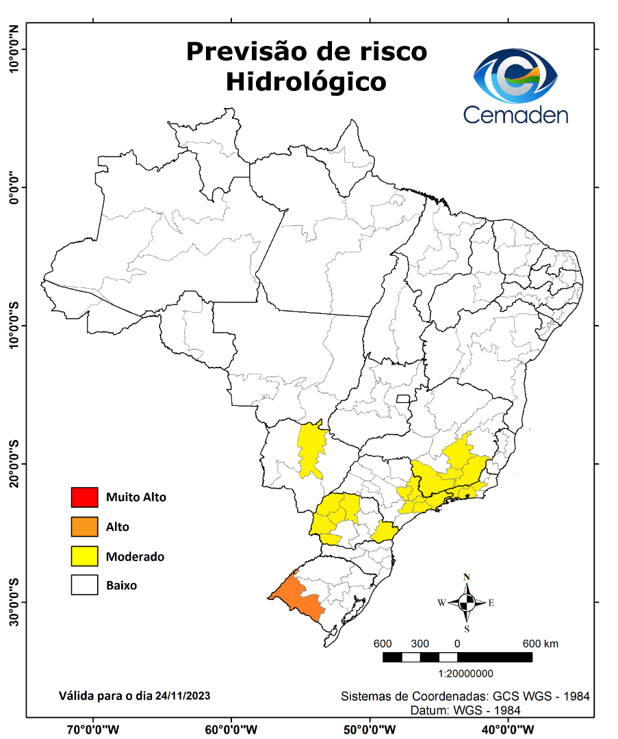 Nesta sexta-feira (24/11/2023), o cenário de risco de eventos geo-hidrológicos para as mesorregiões do Brasil é apresentado a seguir: