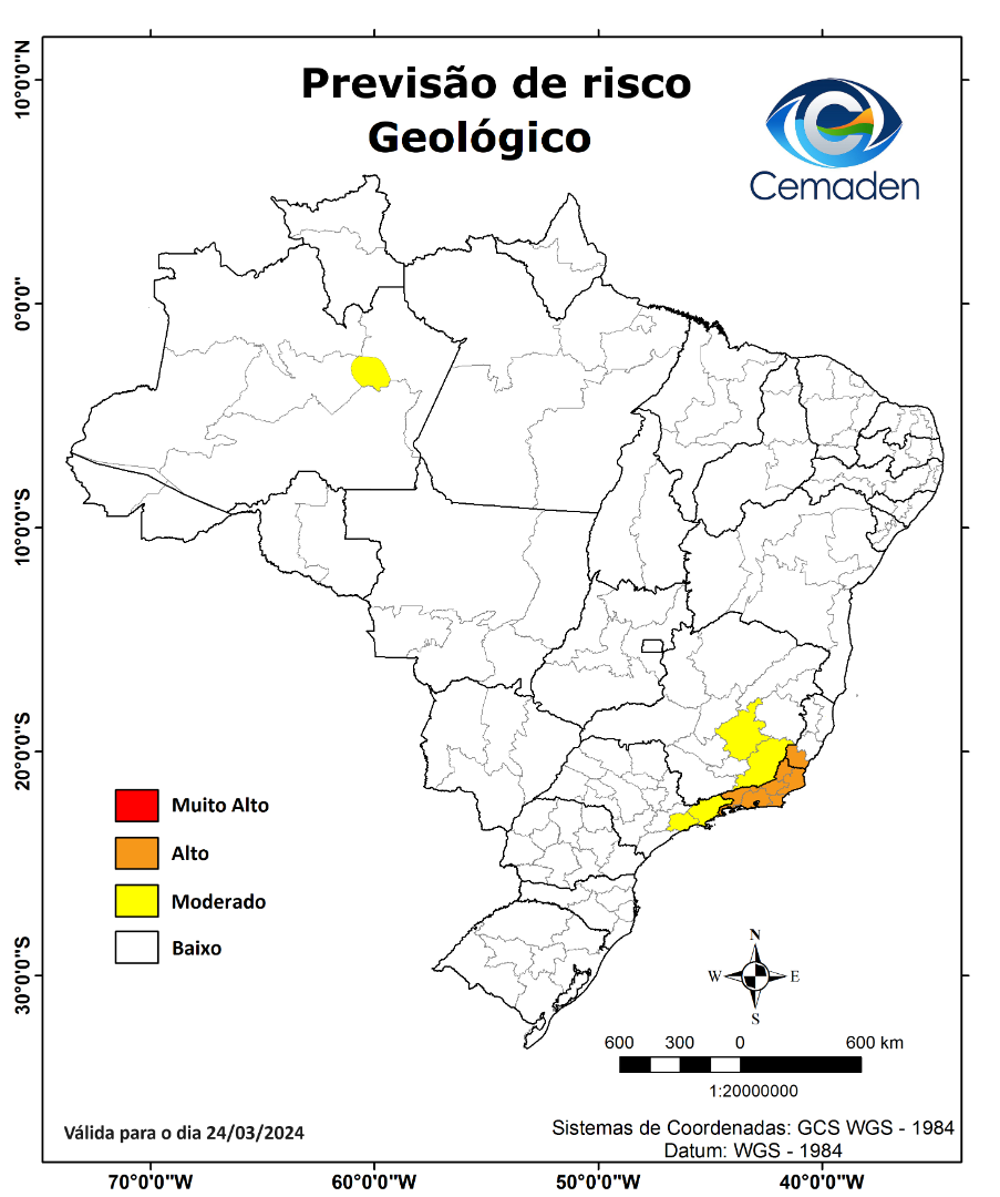 Neste domingo (24/03/2024), o cenário de risco de eventos geo-hidrológicos para as mesorregiões do Brasil é apresentado a seguir: