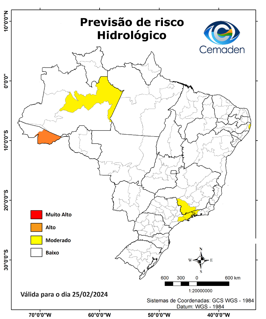 Neste domingo (25/02/2024), o cenário de risco de eventos geo-hidrológicos para as mesorregiões do Brasil é apresentado a seguir: