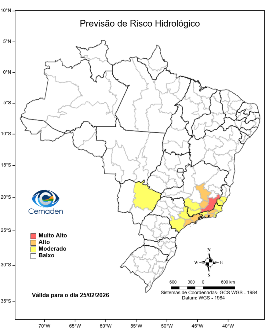Nesta quarta-feira (25/02/2026), o cenário de risco de eventos geo-hidrológicos para as regiões do Brasil é apresentado a seguir: