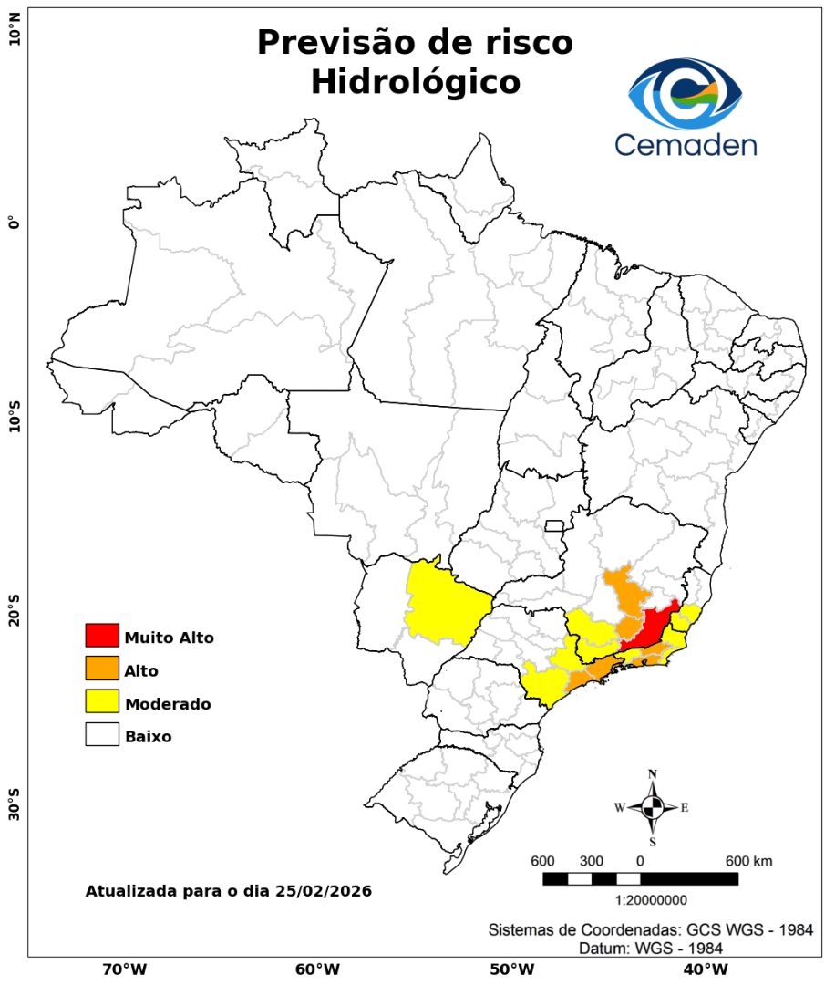 Nesta quarta-feira (25/02/2026), o cenário de risco de eventos geo-hidrológicos para as regiões do Brasil é apresentado a seguir: