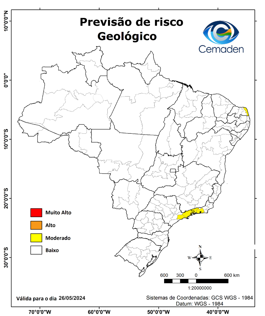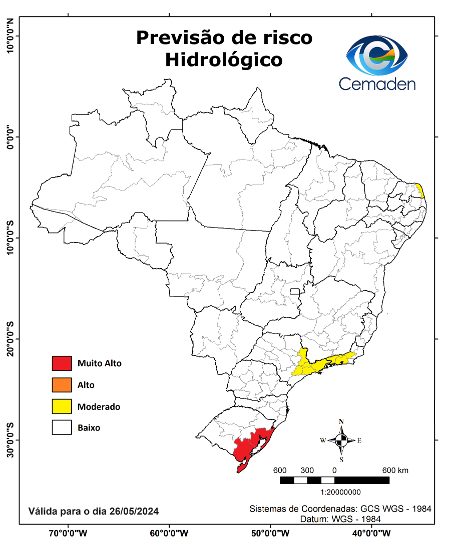 Neste domingo (26/05/2024), o cenário de risco de eventos geo-hidrológicos para as mesorregiões do Brasil é apresentado a seguir: