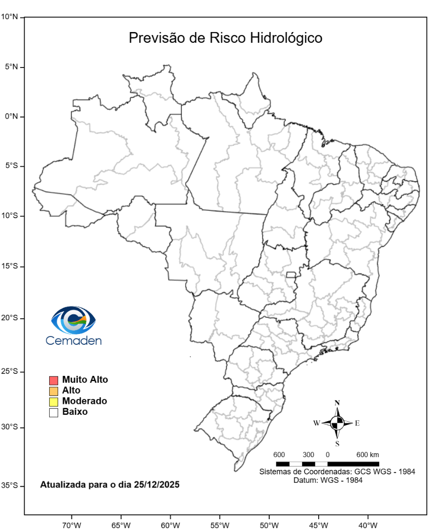 Nesta quinta-feira (25/12/2025), o cenário de risco de eventos geo-hidrológicos para as regiões do Brasil é apresentado a seguir: