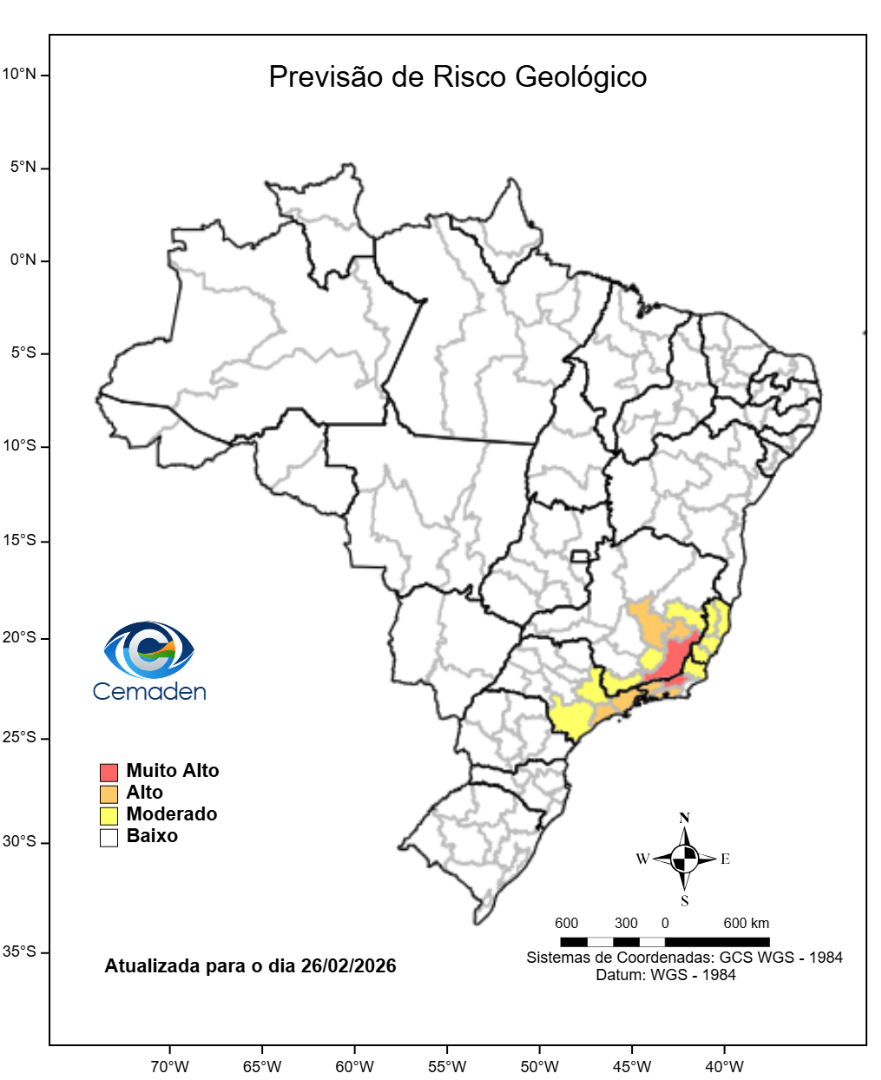 Nesta quinta-feira (26/02/2026), o cenário de risco de eventos geo-hidrológicos para as regiões do Brasil é apresentado a seguir: