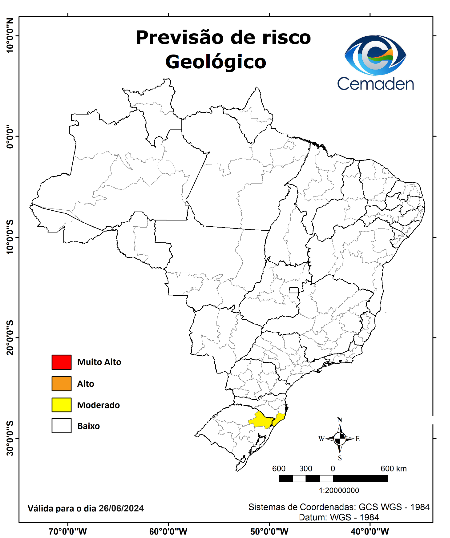Nesta quarta-feira (26/06/2024), o cenário de risco de eventos geo-hidrológicos para as mesorregiões do Brasil é apresentado a seguir: