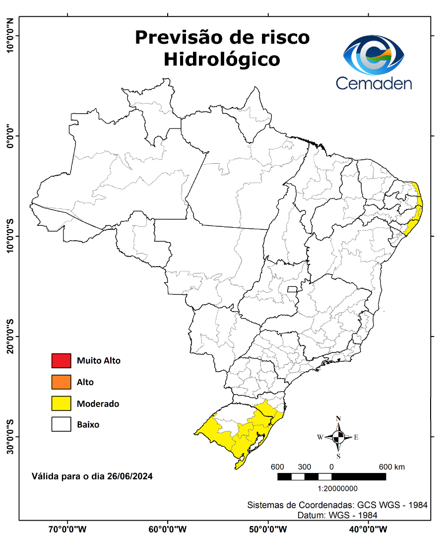 Considera-se MODERADO o cenário de risco hidrológico na porção leste do Nordeste, entre Rio Grande do Norte e Alagoas, com destaque para os municípios densamente ocupados, com baixa permeabilidade do solo, onde há previsão de chuvas ao longo do dia com possibilidade de pancadas, podendo ocasionar inundação de rios e córregos, e alagamentos urbanos em função da extrapolação da capacidade dos sistemas de drenagem (Figura 1).