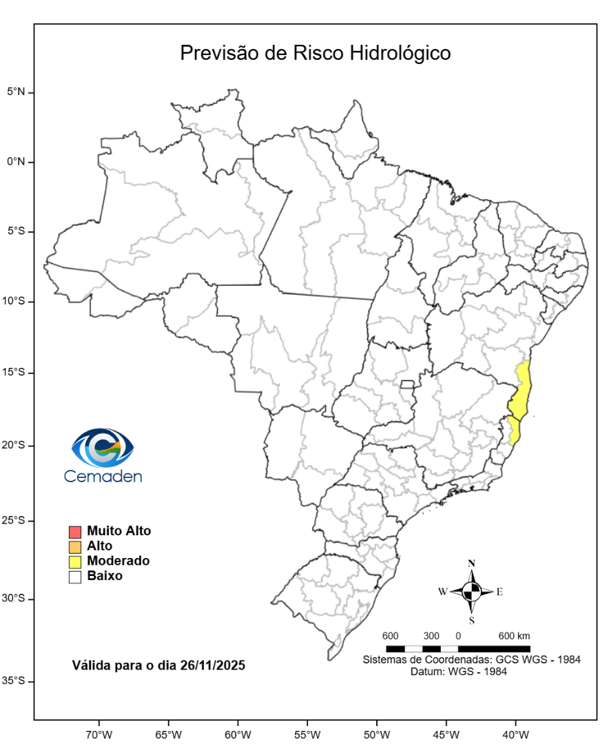 Nesta quarta-feira (26/11/2025), o cenário de risco de eventos geo-hidrológicos para as regiões do Brasil é apresentado a seguir: