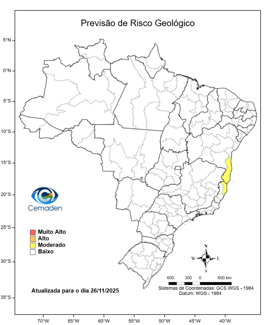 Figura 2 - Probabilidade de ocorrência de deslizamentos em ao menos um município das Regiões Geográficas Intermediárias (e/ou subdivisões regionais) indicadas. Este mapa é elaborado por uma equipe multidisciplinar, levando em consideração as condições dos cenários de riscos geológicos atuais somados à previsão de chuva.