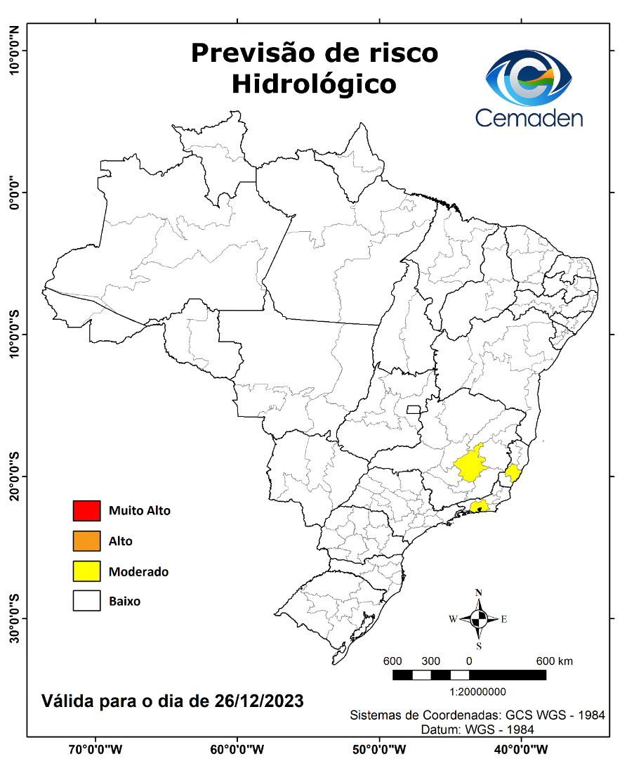 Nesta terça-feira (26/12/2023), o cenário de risco de eventos geo-hidrológicos para as mesorregiões do Brasil é apresentado a seguir: