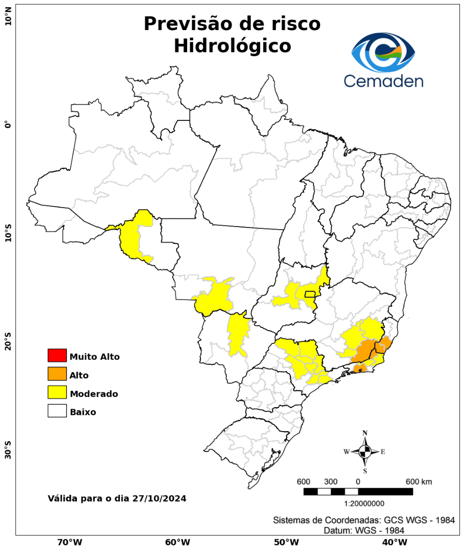 Neste domingo (27/10/2024), o cenário de risco de eventos geo-hidrológicos para as mesorregiões do Brasil é apresentado a seguir: