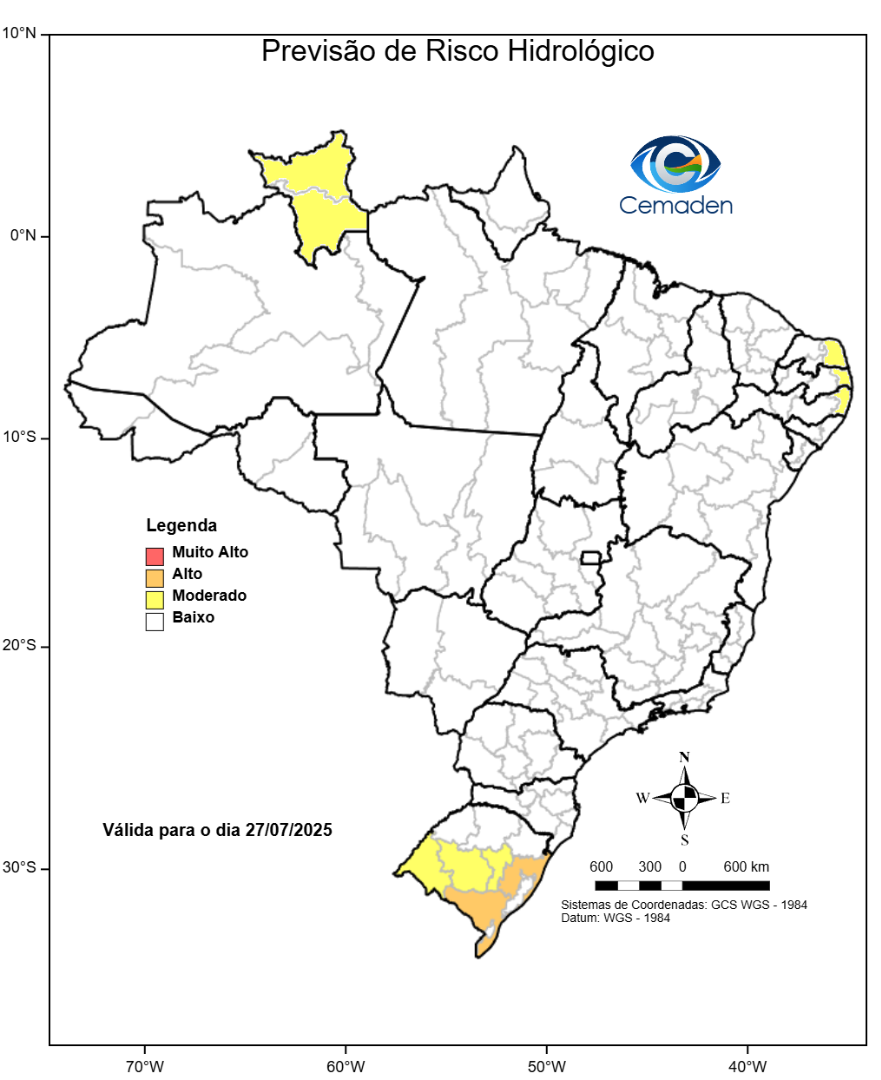Neste domingo (27/07/2025), o cenário de risco de eventos geo-hidrológicos para as regiões do Brasil é apresentado a seguir: