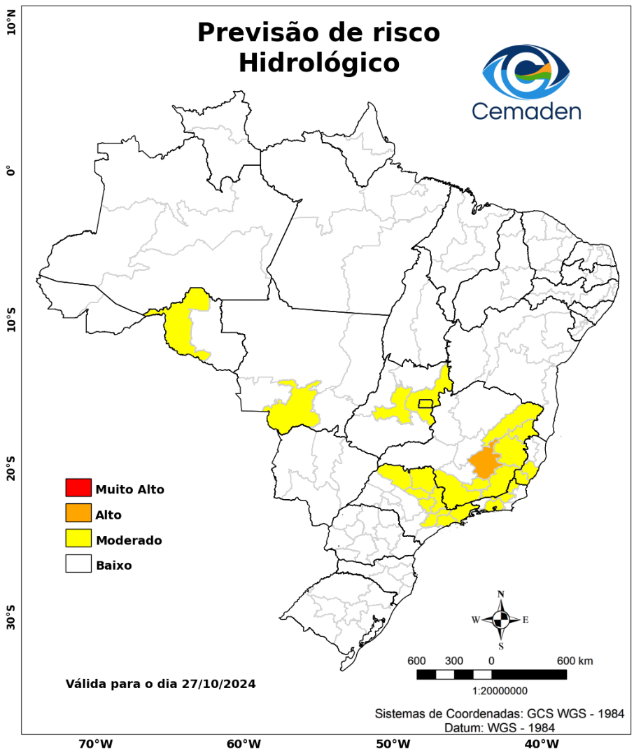 Neste domingo (27/10/2024), o cenário de risco de eventos geo-hidrológicos para as mesorregiões do Brasil é apresentado a seguir:
