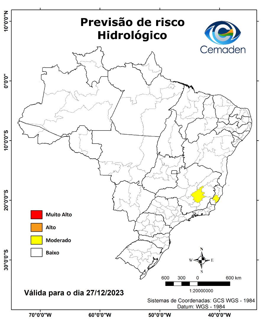 Nesta quarta-feira (27/12/2023), o cenário de risco de eventos geo-hidrológicos para as mesorregiões do Brasil é apresentado a seguir: