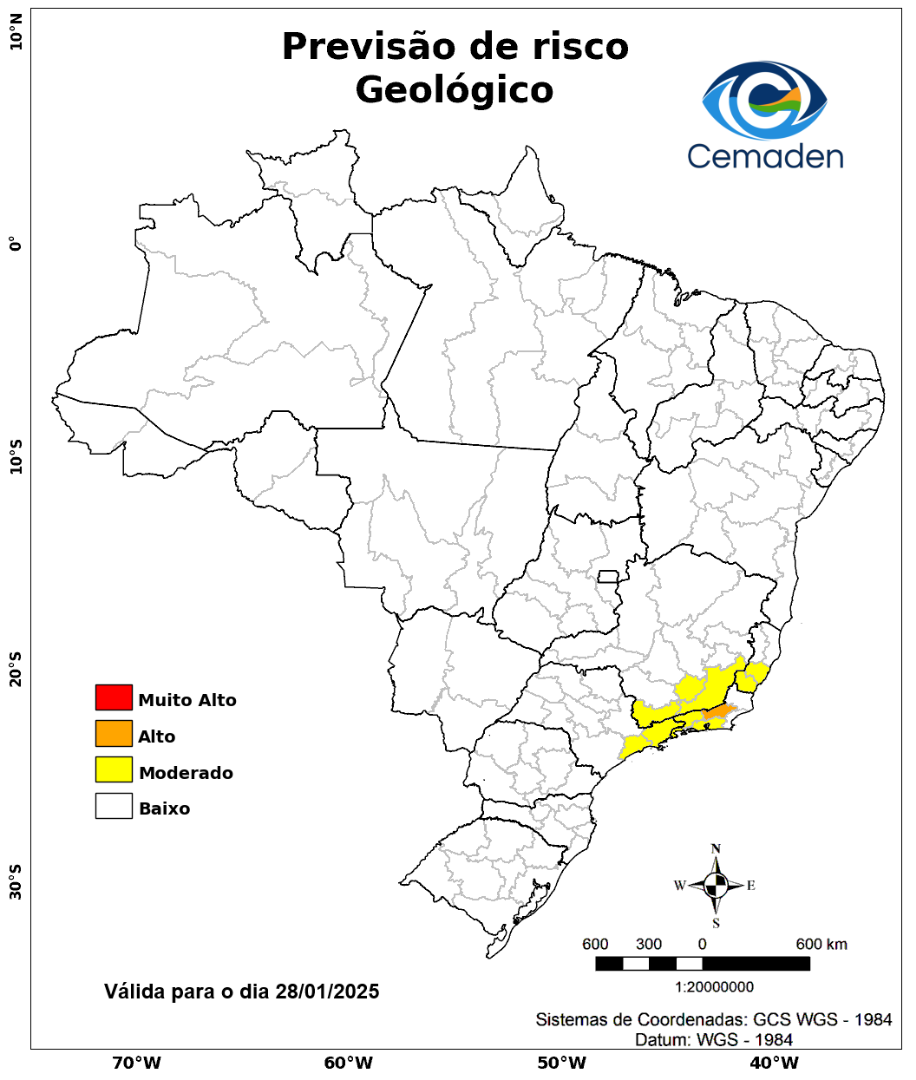 Nesta terça-feira (28/01/2025), o cenário de risco de eventos geo-hidrológicos para as regiões do Brasil é apresentado a seguir: