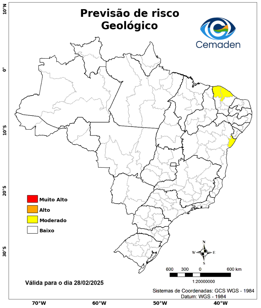 Nesta sexta-feira (28/02/2025), o cenário de risco de eventos geo-hidrológicos para as regiões do Brasil é apresentado a seguir: