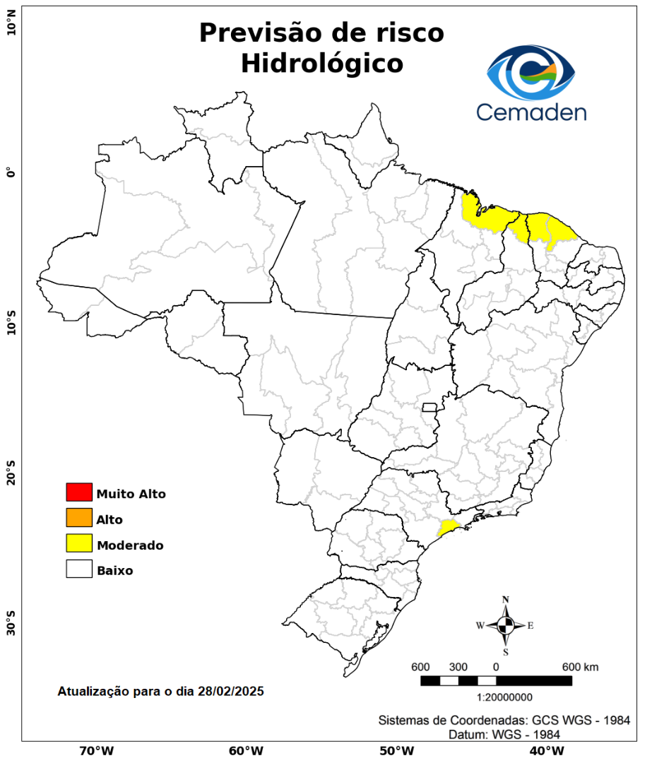 Nesta sexta-feira (28/02/2025), o cenário de risco de eventos geo-hidrológicos para as regiões do Brasil é apresentado a seguir: