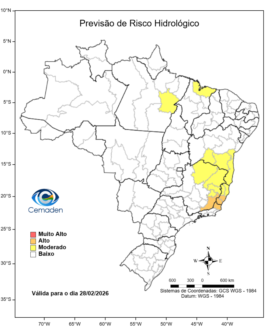Neste sábado (28/02/2026), o cenário de risco de eventos geo-hidrológicos para as regiões do Brasil é apresentado a seguir: