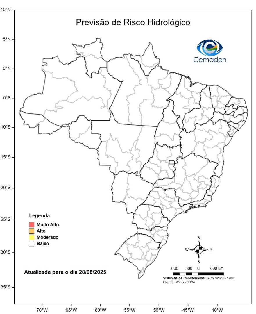 Nesta quinta-feira (28/08/2025), o cenário de risco de eventos geo-hidrológicos para as regiões do Brasil é apresentado a seguir: