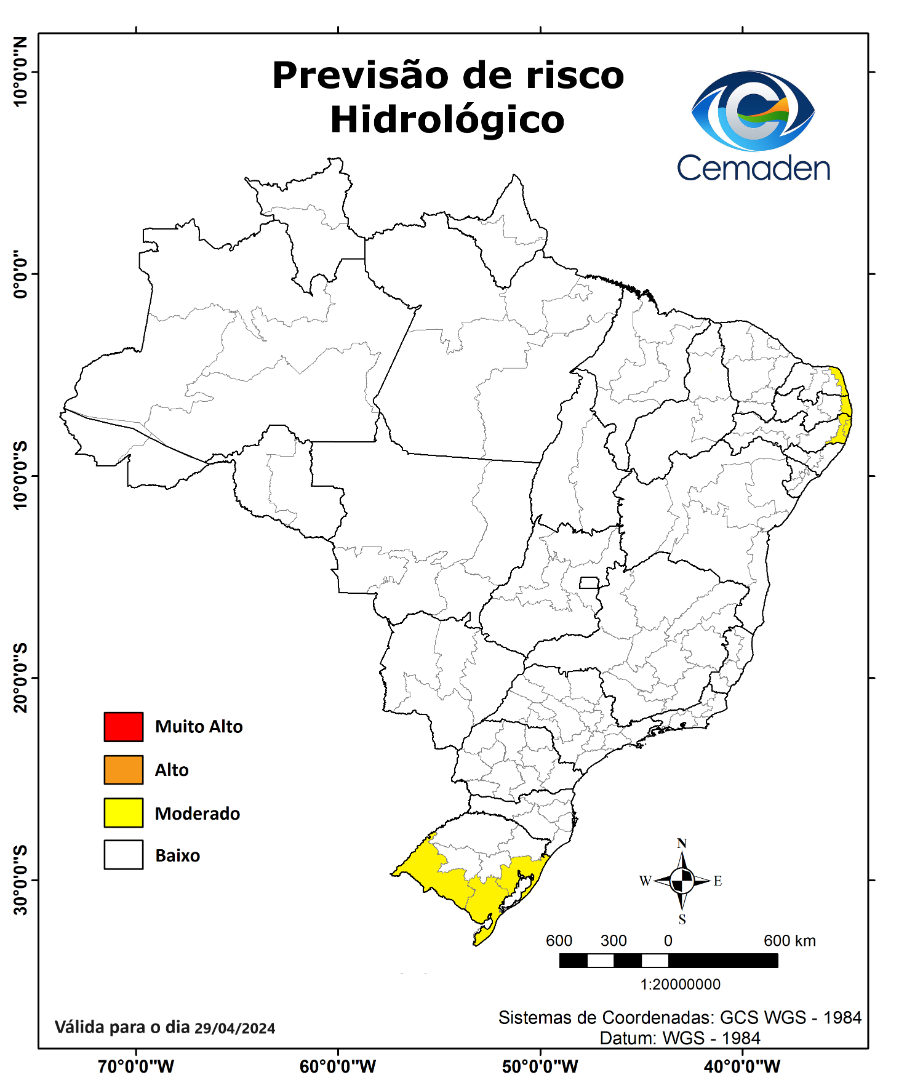 Nesta segunda-feira (29/04/2024), o cenário de risco de eventos geo-hidrológicos para as mesorregiões do Brasil é apresentado a seguir: