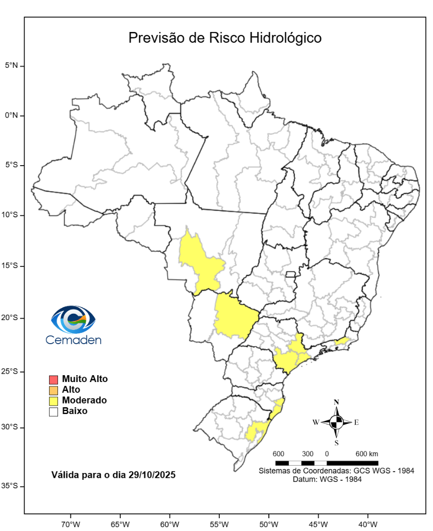 Figura 1 - Possibilidade de ocorrência de eventos hidrológicos em ao menos um município das mesorregiões indicadas. Este mapa é elaborado por uma equipe multidisciplinar, levando em consideração os cenários de riscos hidrológicos atuais somados à previsão de chuva..