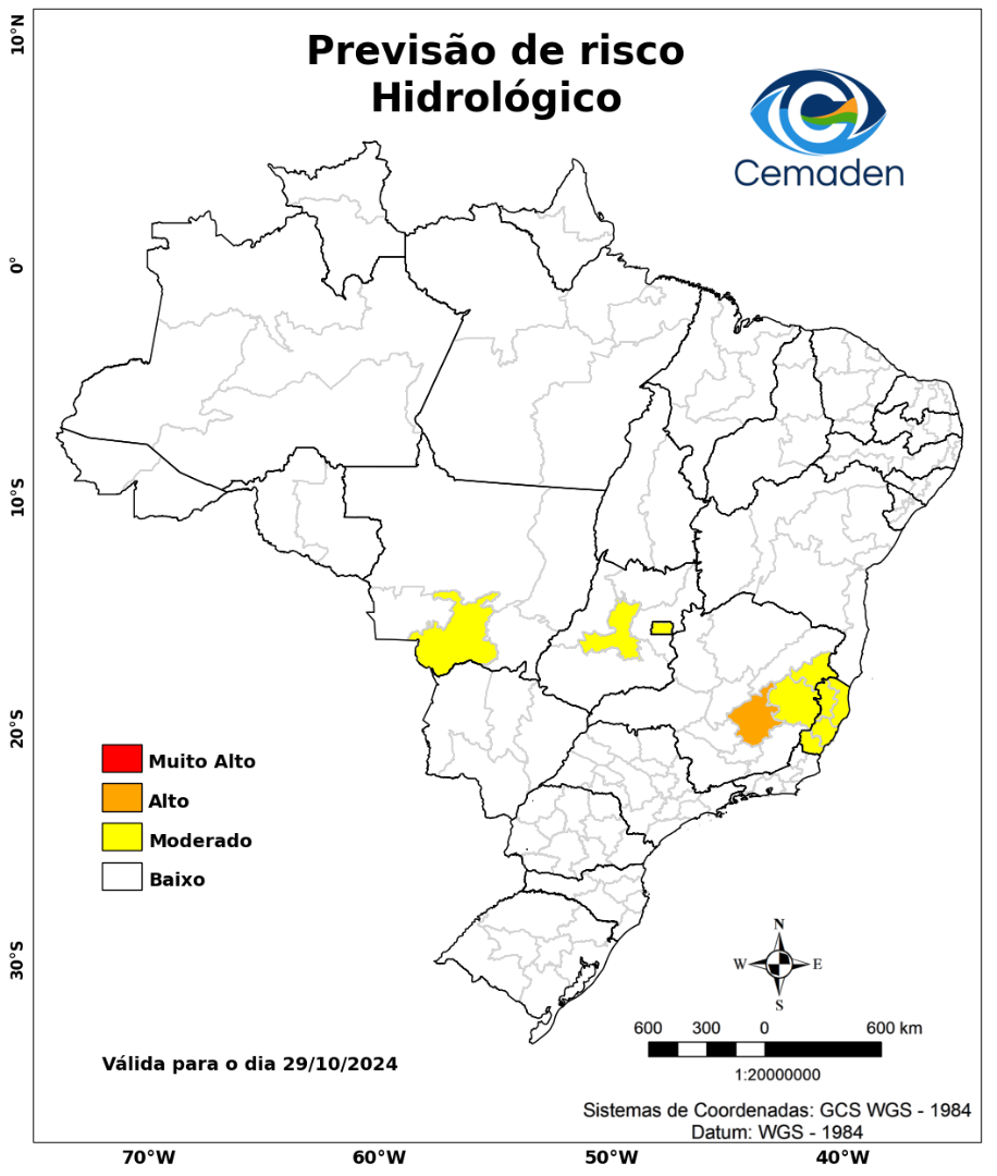 Nesta terça-feira (29/10/2024), o cenário de risco de eventos geo-hidrológicos para as mesorregiões do Brasil é apresentado a seguir:
