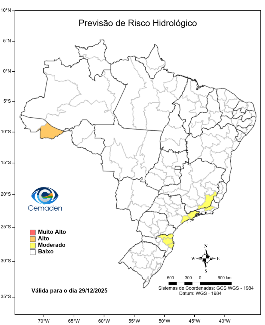 Nesta segunda-feira (29/12/2025), o cenário de risco de eventos geo-hidrológicos para as regiões do Brasil é apresentado a seguir: