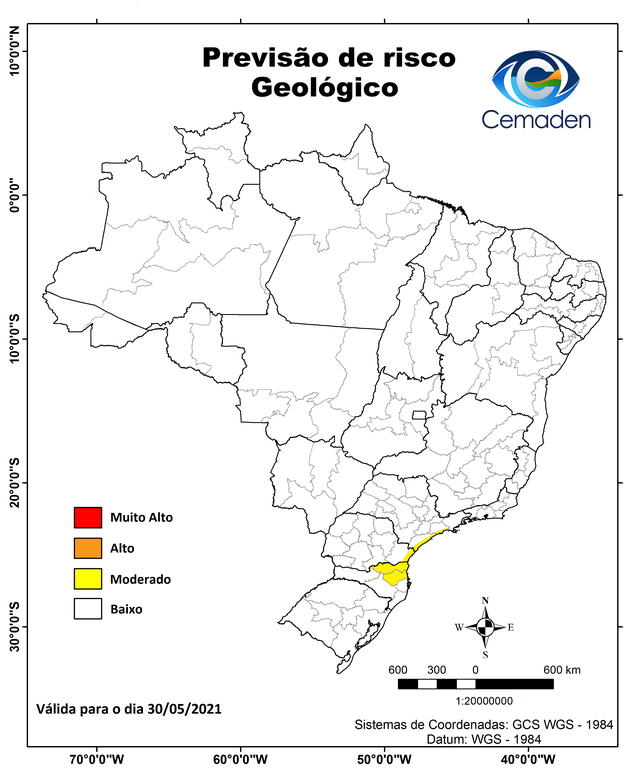 Neste domingo (30/05/2021), o cenário de risco de eventos geo-hidrológicos para as mesorregiões do Brasil é apresentado a seguir: