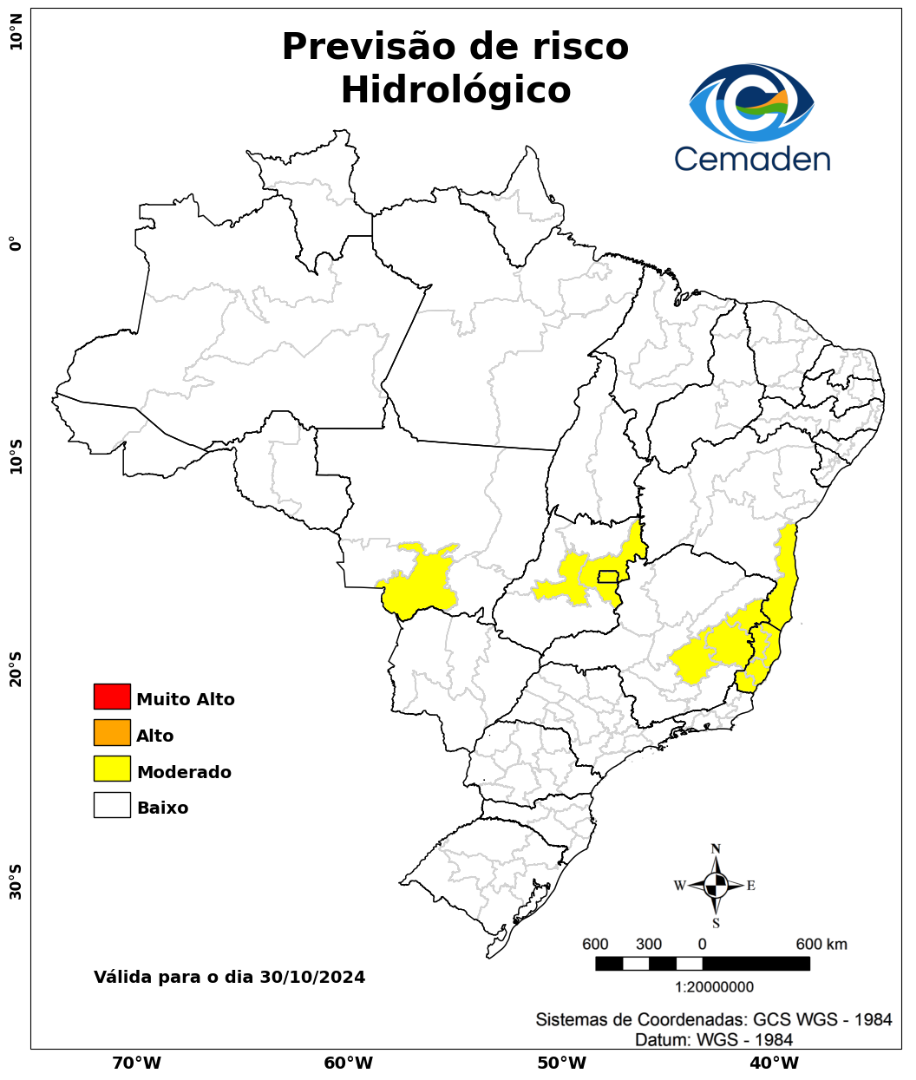 Nesta quarta-feira (30/10/2024), o cenário de risco de eventos geo-hidrológicos para as mesorregiões do Brasil é apresentado a seguir: