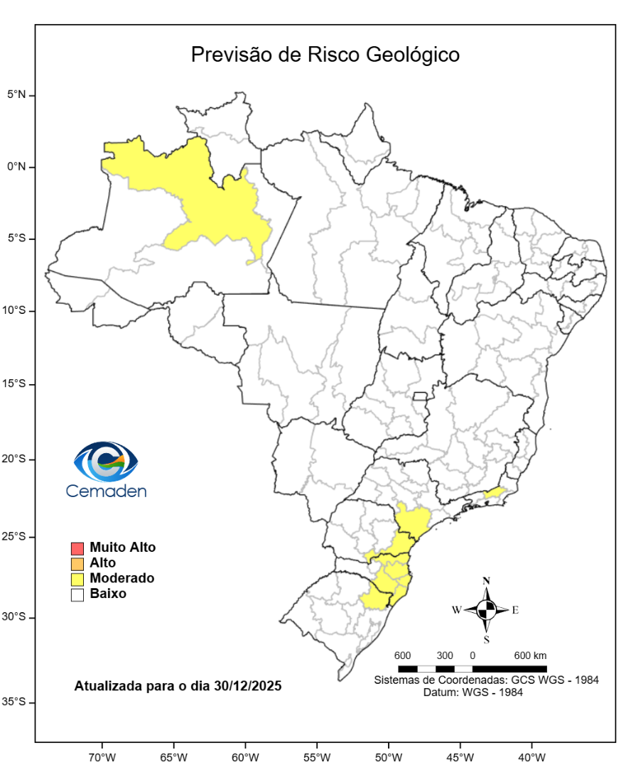 Nesta terça-feira (30/12/2025), o cenário de risco de eventos geo-hidrológicos para as regiões do Brasil é apresentado a seguir: