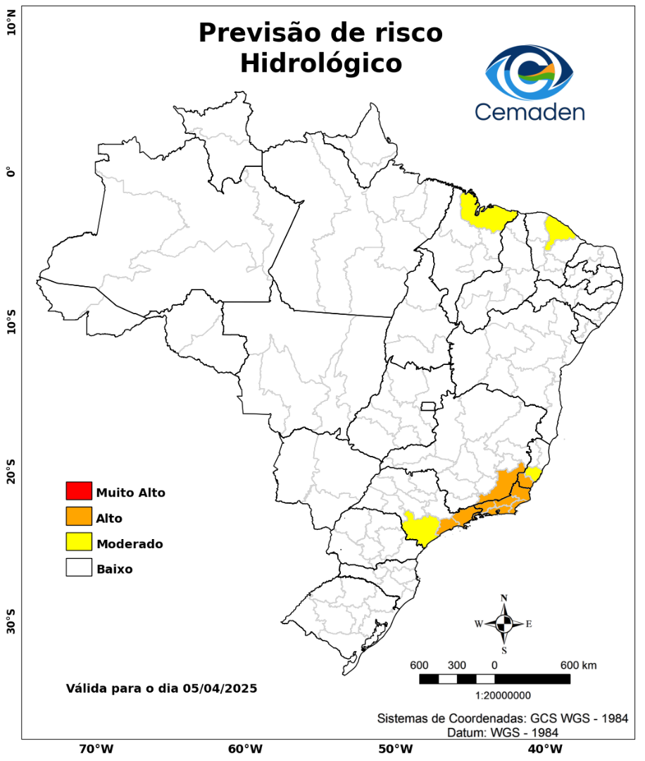 Neste sábado (05/04/2025), o cenário de risco de eventos geo-hidrológicos para as regiões do Brasil é apresentado a seguir: