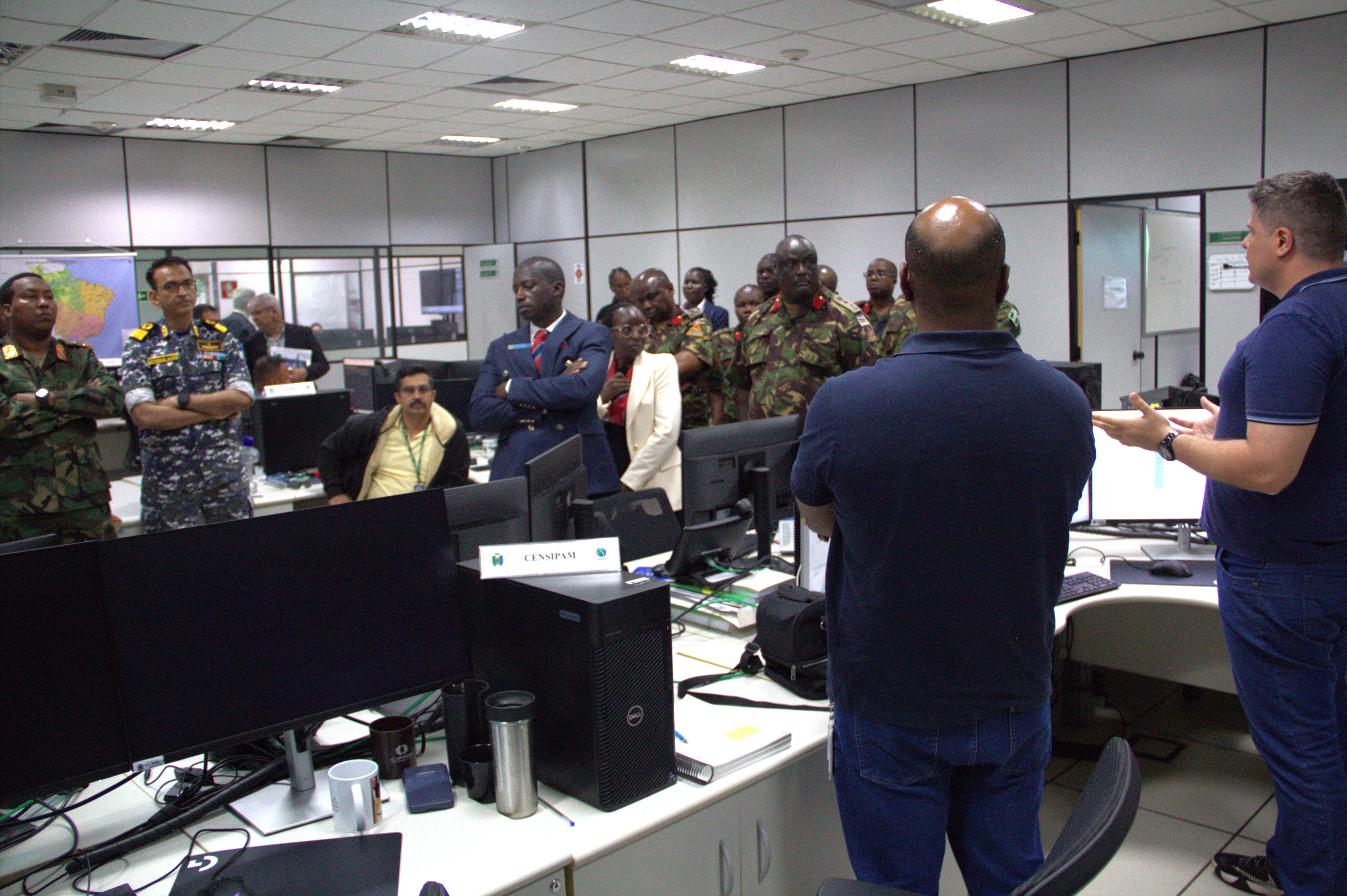 Brasília, 29/04/2025 –Representantes da National Defence College (NDC) do Quênia realizaram, nesta terça-feira (29), uma visita ao Centro Gestor e Operacional do Sistema de Proteção da Amazônia (Censipam), em Brasília. A comitiva, que também contou com integrantes da Nigéria, Somália, Índia e Gana, foi recebida pelo Diretor-Geral Adjunto do órgão, Harley Ângelo de Morais, que apresentou as principais atividades desenvolvidas pelo centro e as tecnologias empregadas para o monitoramento da região amazônica.